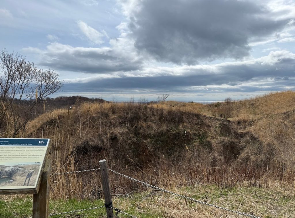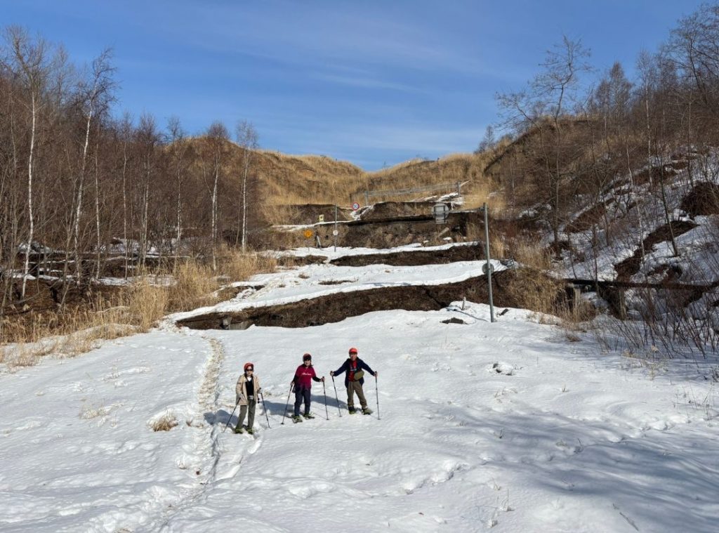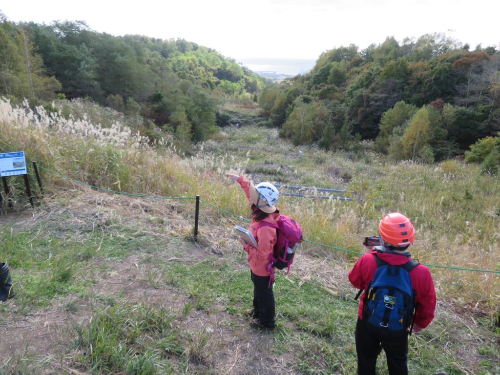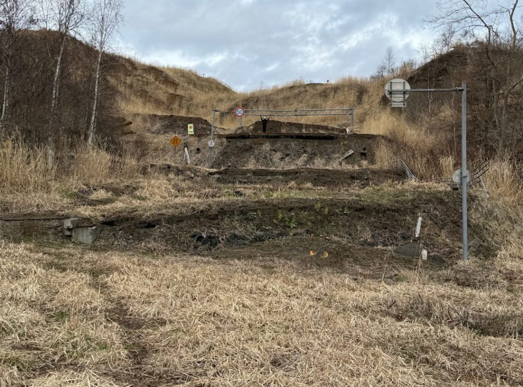かつてはガイド自身も車で走っていた旧国道230号線が、断層活動により階段状になったエリアを歩きます(規制区域に特別に入域します)