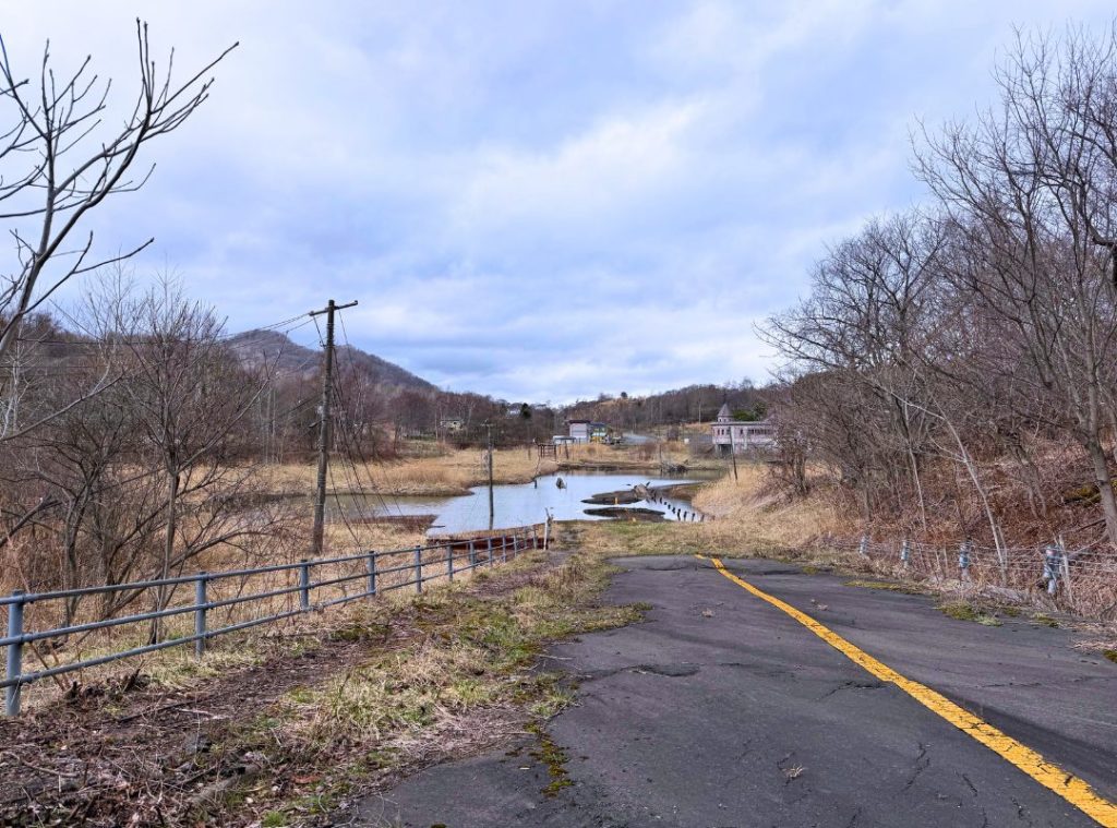 断層活動により池になってしまったエリアの旧国道230号線。今は水鳥が遊ぶ。